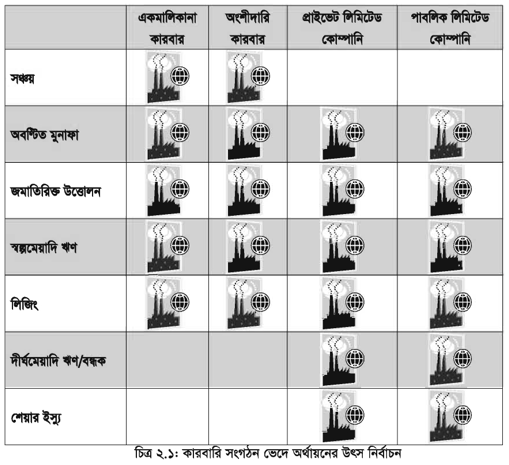 চিত্রে প্রথম লাইনে আমরা দেখছি, সঞ্চয় উৎসটি একমালিকানা ও অংশীদারি কারবারের জন্য উপযোগী। এরপর দেখা যাচ্ছে অবণ্টিত মুনাফা, জমাতিরিক্ত উত্তোলন, স্বল্পমেয়াদি ঋণ ও লিজিং সব ধরনের সংগঠনের জন্যই গ্রহণযোগ্য। তবে দীর্ঘমেয়াদি ঋণ ও শেয়ার ইস্যু শুধু কোম্পানির ক্ষেত্রে প্রযোজ্য।
