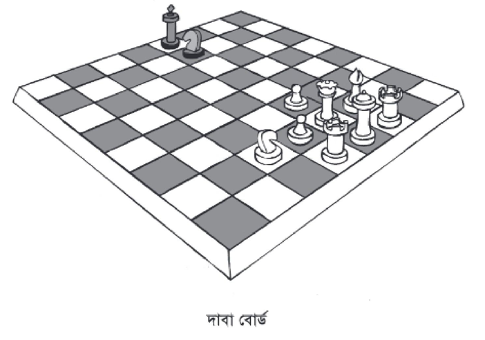 দাবা বোর্ড: দাবা বোর্ড ৬৪টি সম-আকৃতি বর্গক্ষেত্র নিয়ে গঠিত। বোর্ডের ক্ষেত্রগুলো সাদা ও কালো রং দিয়ে একের পর এক ধারাক্রমে সজ্জিত। বোর্ডের সাদা ঘর খেলোয়াড়দের ডান দিকে থাকবে। খেলা আরম্ভের সময় একজন খেলোয়াড়ের ১৬টি সাদা এবং অপরজনের ১৬টি কালো রঙের ঘুঁটি থাকে। ঘুঁটিগুলোর মধ্যে ১টি রাজা, ১টি মন্ত্রী, ২টি নৌকা, ২টি হাতি, ২টি ঘোড়া, ৮টি বোড়ে বা পণ থাকে।