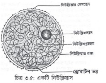একটি নিউক্লিয়াস প্রধানত (১) নিউক্লিয়ার মেমব্রেন (২) নিউক্লিওপ্লাজম (৩) ক্রোমাটিন তন্ত্র ও (৪) নিউক্লিওলাস নিয়ে গঠিত।