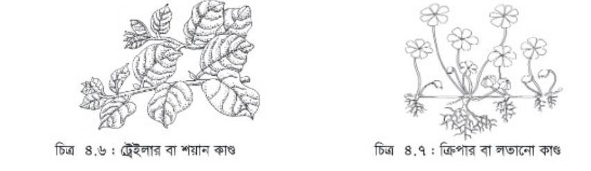 ক) ক্রিপার বা লতানো: এসব কাণ্ড মাটির উপর দিয়ে সমান্তরালভাবে বৃদ্ধি পায়। এদের প্রতিটি পর্ব থেকে গুচ্ছমূল বের হয়ে মাটিকে আঁকড়ে ধরে, যেমন- ঘাস, আমরুল ইত্যাদি।