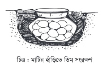 ৩. মাটির হাঁড়িতে ডিম সংরক্ষণ: সাধারণত ডিম ৫-১০ দিনের বেশি ভালো থাকে না। ঘরের মেঝেতে গর্ত করে সেই গর্তে হাঁড়ি বসিয়ে ডিম রাখা হয়। গর্তে হাঁড়ির চারদিকে কাঠ কয়লা রেখে পানি দিয়ে ভিজিয়ে রাখলে ডিম ঠান্ডা থাকে এবং ২০-২৫ দিন ডিম ভালো থাকে।