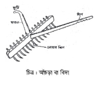 আঁচড়া বা বিদা: আঁচড়া বা বিদা কাঠ ও বাঁশ বা লোহার খিল দিয়ে তৈরি করা হয়। আঁচড়ার ১.৫ মি. লম্বা একটি দণ্ড থাকে। এই দণ্ডে ১০ সেমি পরপর ছিদ্র থাকে। ছিদ্রপথে বাঁশের বা লোহার খিল লাগানো হয়। এতে হাতল ও ঈশ লাগানো হয়। আঁচড়ার প্রধান কাজ হলো: