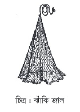 ক) ঝাঁকি জাল: ঝাঁকি জালের উপরের প্রান্তে সরু রশি বাঁধা থাকে। জালের নিচের দিকে লোহার ছোট ছোট কাঠি যুক্ত করা হয়, যাতে পানিতে জাল ফেললে তাড়াতাড়ি ডুবে যেতে পারে। মাছ ধরার সময় খাল, পুকুর বা নদীর তীর থেকে রশিটি হাতে রেখে জাল পানিতে ছুড়ে মারা হয়। পরে রশি ধরে টেনে জাল তোলা হয়। জালের নিচে অনেক ধরনের মাছ আটকা পড়ে। পুঁটি, চিংড়ি, কার্প ও নলা মাছ বেশি ধরা পড়ে।