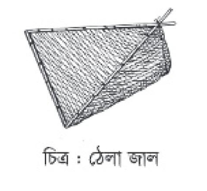 খ) ঠেলা জাল: ঠেলা জাল তিন কোনা। এটাকে তিন কোনা বাঁশের ফ্রেমে আটকানো হয়। ঠেলা জাল দিয়ে সাধারণত ছোট ছোট মাছ ধরা হয়। ঠেলা জালের হাতল ধরে পানিতে নেমে সামনের দিকে নিলে এই জালে পুঁটি, খলিসা, চিংড়ি, বেলে ইত্যাদি মাছ ধরা পড়ে।