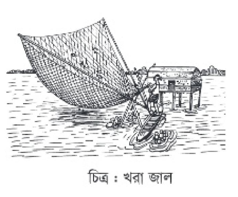 গ) খরা জাল: এটি একটি ত্রিভুজাকৃতির জাল যা বাঁশের মাচা বা টং থেকে চালানো হয়। জাল ইংরেজী "V" আকৃতির বাঁশের কাঠামোর মাঝখানে বাঁধা থাকে। জালটি নদী বা বিলে মাছের চলাচলের পথে পানিতে ডুবিয়ে রাখা হয়। একটি নির্দিষ্ট সময় পর পর জালের পিছনের দিকে বাঁশের গোড়ায় চাপ দিলে জাল উপরে উঠে আসে। এর পর জালে আটকা পড়া মাছ সংগ্রহ করা হয়।