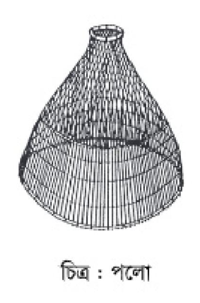 ২। পলো: পলো মাছ ধরার একটি প্রাচীন পদ্ধতি। এটি বাঁশের শলাকা ও বেত দিয়ে তৈরি। এর নিচের দিকের মুখ গোলাকার ও বড় এবং উপরের দিকের মুখও গোলাকার কিন্তু ছোট। দুই মুখই খোলা থাকে।