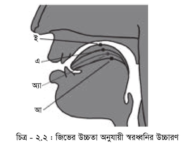 জিভের উচ্চতা অনুসারে স্বরধ্বনিগুলোকে (ক) উচ্চ, (খ) নিম্ন, (গ) উচ্চ-মধ্য ও (ঘ) নিম্ন-মধ্য স্বরধ্বনি হিসেবে নির্দেশ করা হয়।