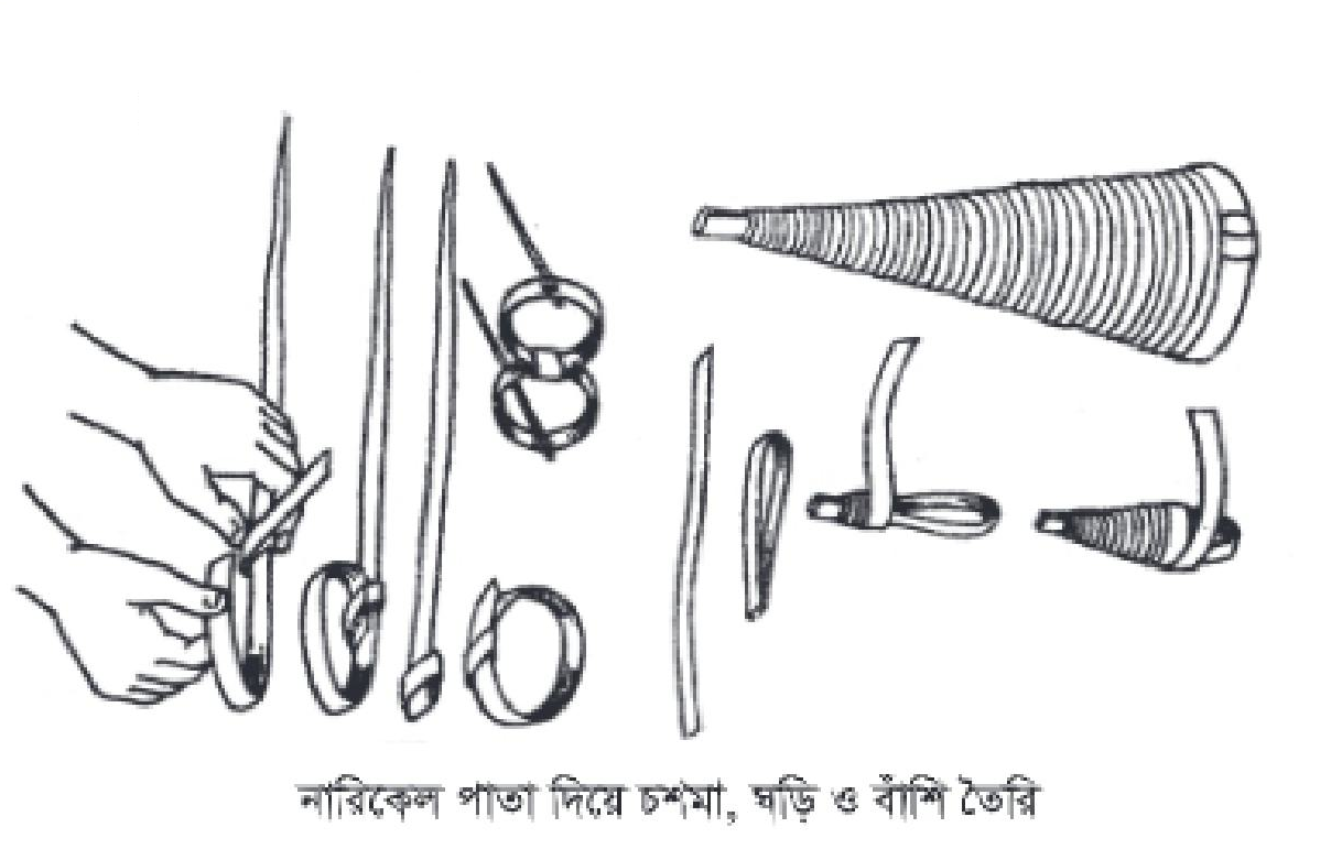 তালপাতা, খেজুর পাতা ও নারকেল পাতা একই পদ্ধতিতে রং করা যায়। কিছু পাতা সাদা ও কিছু পাতা রঙিন করলে তৈরিকৃত জিনিস আরও আকর্ষণীয় ও দৃষ্টিনন্দন হবে। বাজারে রঙের দোকানে এক জাতীয় গুঁড়ো রং পাওয়া যায়। সামান্য রং, পরিমিত পানি ও কয়েক ফোঁটা এসিটিক এসিড সহকারে ফুটন্ত পানিতে শুকনো পাতাগুলো কিছুক্ষণ নাড়াচাড়া করে নিতে হবে। নামাবার পূর্বে পরিমাণমতো গুঁড়ো সাবান দিয়ে নামিয়ে নিতে হবে। এরপর কিছুক্ষণ ছায়ায় শুকিয়ে নিলে কাজের উপযোগী রঙিন পাতা হয়ে গেল। এসিড পাওয়া না গেলে পরিবর্তে সামান্য লবণ দিয়ে নামিয়ে নিব। এই পাতাগুলো দিয়ে নিচের ছবিগুলো দেখে চশমা, বাঁশি, ঘড়ি ইত্যাদি আমরা তৈরি করার চেষ্টা করি। (ছবি দেখে চেষ্টা করি)