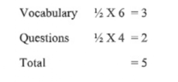 Altogether 10 MCQs will be set. Each MCQ will have ½ mark (or half mark) for a correct answer. There should be 6 MCQs on vocabulary test (guessing meaning from the context) and 4 MCQs on answering questions (scanning for specific information, search reading, deducing the meaning of unfamiliar words). Thus the marks distribution will be:
