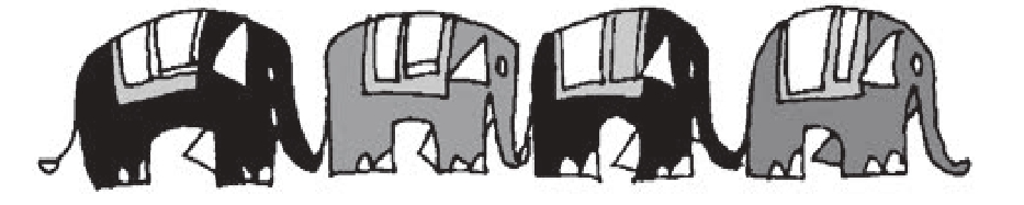 Elephants walking along the trails are holding hands by holding tails. Trunks and tails are handy things when elephants walk in circus rings. And when they walk, it never fails, they're holding hands by holding tails.