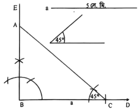 একটি সমকোণী ত্রিভুজের একটি বাহু 5 সে. মি. এবং একটি সূক্ষ্মকোণ 45° দেওয়া আছে। ত্রিভুজটি আঁক