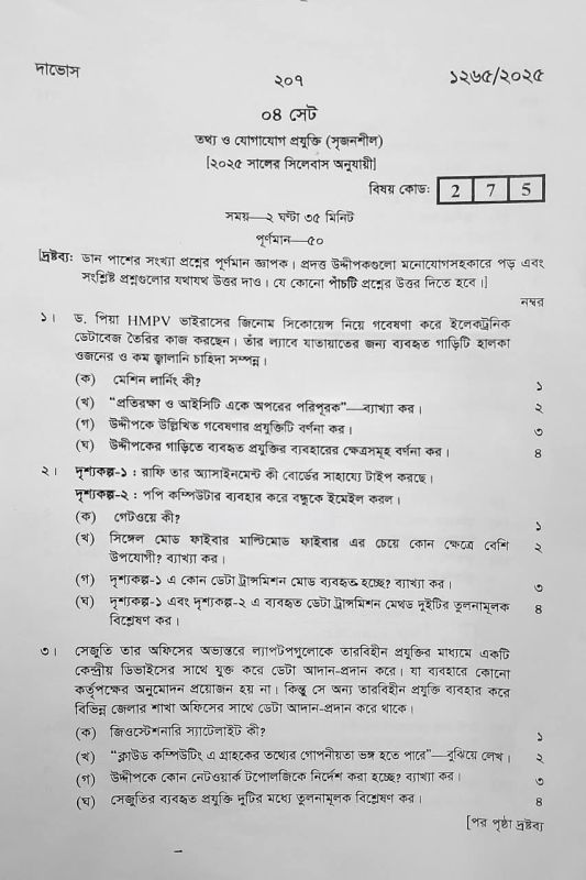 ১। ড. পিয়া HMPV ভাইরাসের জিনোম সিকোয়েন্স নিয়ে গবেষণা করে ইলেকট্রনিক ডেটাবেজ তৈরির কাজ করছেন। তাঁর ল্যাবে যাতায়াতের জন্য ব্যবহৃত গাড়িটি হালকা ওজনের ও কম জ্বালানি চাহিদা সম্পন্ন। (ক) মেশিন লার্নিং কী? (... View more