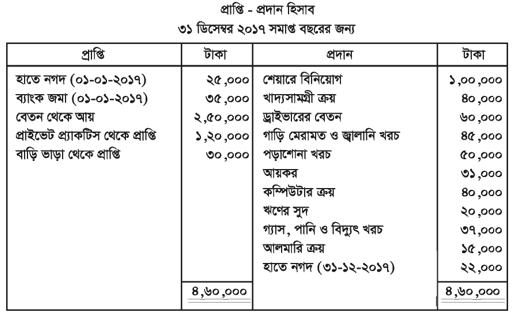 জনাব আজিজ পেশায় একজন চিকিসৎক । তিনি চাকরির পাশাপাশি প্রাইভেট প্র্যাকটিসের মাধ্যমে অর্থ উপার্জন করেন ৩১ ডিসেম্বর ২০১৭ সালের সমাপ্ত বছরের তার পরিবারের প্রাপ্তি -প্রদান হিসাব ছিল নিম্নরূপ: