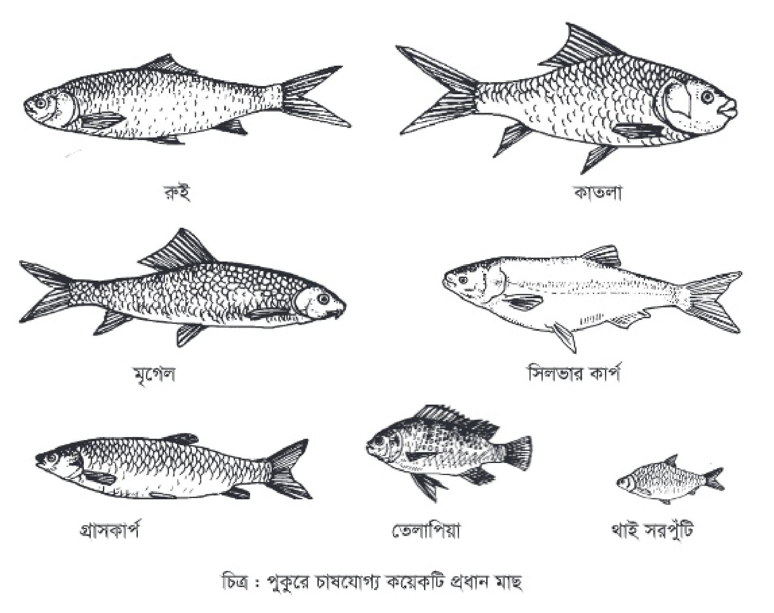 বাংলাদেশে পানিতে অনেক রকমের মাছ পাওয়া গেলেও সব মাছ পুকুরে চাষ করা যায় না। যে সকল মাছের পোনা সহজলভ্য, তাড়াতাড়ি বাড়ে, বাজারে চাহিদা ও ভালো দাম রয়েছে, পুষ্টিমান ভালো ও খেতে সুস্বাদু, সে সকল মাছই পুকুরে চাষ করা হয়। তাছাড়া এসব মাছ পুকুরের প্রাকৃতিক খাবার ও বাইরে থেকে দেওয়া সম্পূরক খাবার দক্ষতার সাথে হজম করতে পারে।