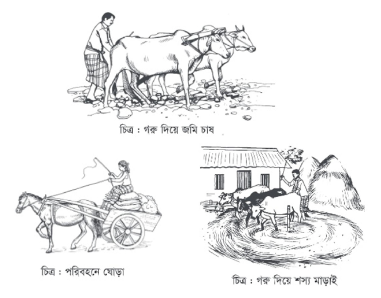 গরু ও মহিষ জমি চাষ, পরিবহন, শস্য মাড়াই, ঘানিটানা এবং শস্য নিড়ানির কাজে ব্যবহৃত হয়ে আসছে। গৃহপালিত পশু-পাখি আমাদের পরিবেশের ভারসাম্য রক্ষা করে। কৃষি-জমির আগাছা, ফসলের উপজাত, রান্না ঘরের বর্জ্য এদের খাবার হিসাবে ব্যবহার করা হয়। হাঁস-মুরগি পোকামাকড় ও ঝরে পড়া দানা শস্য খেয়ে প্রাকৃতিক ভারসাম্য রক্ষায় সহায়তা করে। ভেড়ার পশম শীতবস্ত্র তৈরিতে ব্যবহৃত হয়।