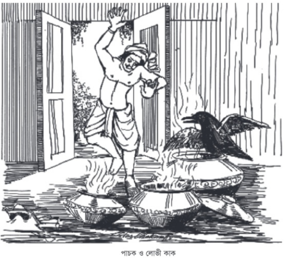 এদিকে পাচক রান্না শুরু করল। রান্নার হাঁড়ি থেকে বাষ্প বেরোনোর জন্য হাঁড়ির মুখ একটু খোলা রাখল। একটা হাঁড়ির মুখ ঝাঁঝরি দিয়ে ঢেকে দিল। রান্নার সুগন্ধ চারদিকে ছড়িয়ে পড়ল। এ সময় পাচক গায়ের ঘাম শুকানোর জন্য রান্নাঘরের বাইরে বারান্দায় গেল। কাক ঠিক সে সময় ঝুড়ি থেকে বেরিয়ে হাঁড়ির ওপর ঝাঁঝরিতে গিয়ে বসল। তখনই ঝাঁঝরিটা মাটিতে পড়ে ঝন্ঝন্ শব্দ হলো। পাচক সেই শব্দ শুনে রান্নাঘরে ছুটে এল।