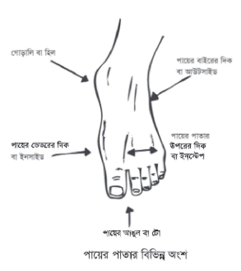 এছাড়া পায়ের আঙুলের দিককে টো এবং পায়ের পেছনের দিককে হিল (গোড়ালি) বলে।