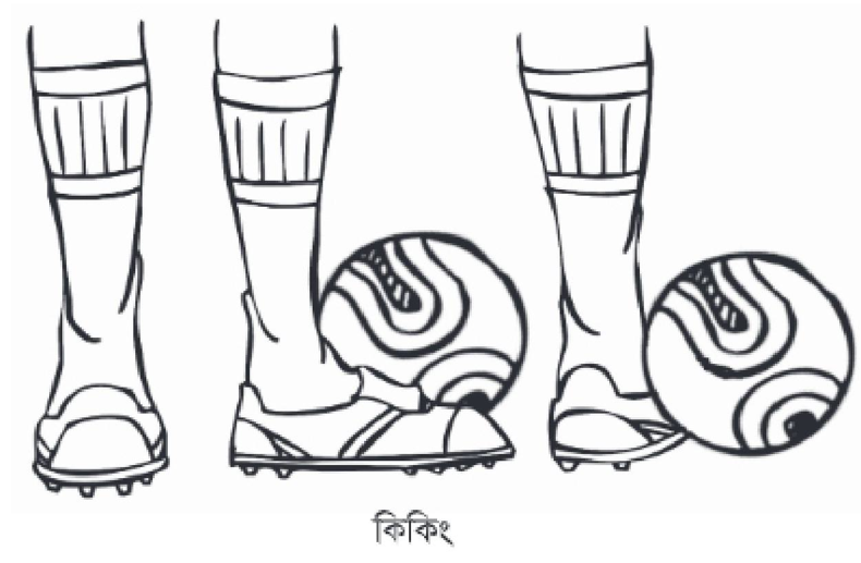 ক) কিকিং: পায়ের বিভিন্ন অংশ দিয়ে নানা রকম কিক মারা যায়। ইনসাইড কিক সহজ এবং খুব সহজে আয়ত্ত করা যায়। ইনসাইড কিক মারার সময় নন-কিকিং ফুট ফুটবলের লাইনের সামান্য পেছনে এবং বল থেকে ৬-৮ ইঞ্চি দুরে স্থাপন করে বলের ওপর দৃষ্টি রেখে পায়ের বাঁকানো অংশ দিয়ে কিক মারতে হয়। যে পা দিয়ে কিক মারবে তার বিপরীত পায়ের ওপর দেহের ভর রেখে দুই হাত সামান্য প্রসারিত করে কিক করবে। কিক করার পর কিকিং ফুট ফুটবলের দিকে এগিয়ে যাবে। এছাড়া নিচু সোজা কিক শুধু পায়ের উপরের অংশ ব্যবহার করে বলের মাঝখানে কিক মারতে হয় এই কিককে লো হার্ড কিক বলে।