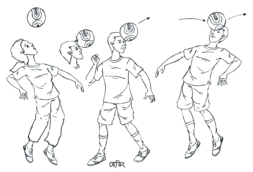 খ) হেডিং: মাথা দিয়ে বল খেলাকে হেডিং বলে। হেড করার সময় বল এর দিকে দৃষ্টি রেখে দেহকে সামান্য পেছনে এনে ঘাড় শক্ত করে মাথার সামনের অংশ (কপাল) দিয়ে হেড করতে হয়। হেড করে বলকে সামনে, পেছনে ও পাশে পাঠানো যায়।
