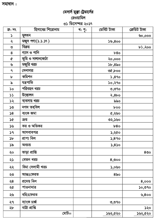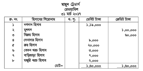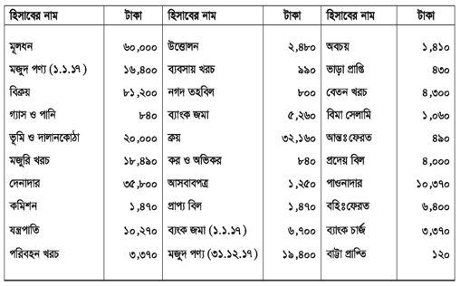 মামুন ট্রেডার্সের হিসাব বই হতে ২০১৭ সালের ৩১ মার্চ তারিখে খতিয়ান উদ্বৃত্তসমূহ ছিল—