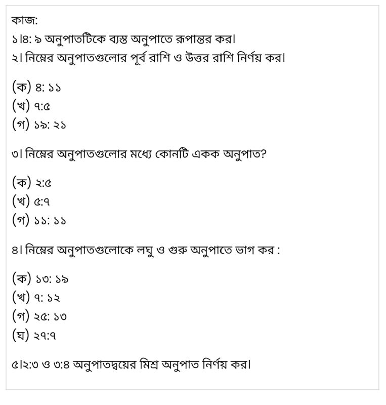 অনুপাত গুলোর পূর্বরাশি ও উত্তররাশি নির্নয় কর। (ক) ৪:১১,(খ)৭:৫,(গ)১৯:২১