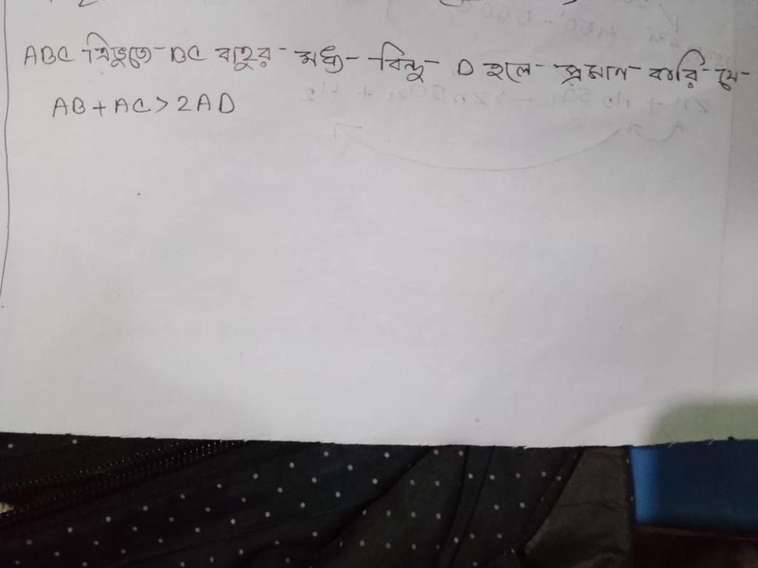 ABC ত্রিভুতে BC বাহুর মধ্য বিন্দু ০ হলে প্রমাণ করি যে AB + AC > 2AD