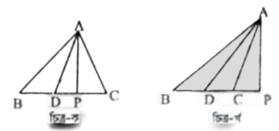 প্রমাণ: △ ABD এর ∠ADB স্থূলকোণ এবং BD রেখার বর্ধিতাংশের ওপর AD রেখার লম্ব অভিক্ষেপ DP [উভয় চিত্রে]