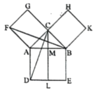 অঙ্কন: AB, AC এবং BC বাহুর উপর যথাক্রমে ABED, ACGF এবং BCHK বর্গক্ষেত্র অঙ্কন করি। C বিন্দু দিয়ে AD বা BE রেখার সমান্তরাল CL রেখা আঁকি। মনে করি, তা AB কে M বিন্দুতে এবং DE কে L বিন্দুতে ছেদ করে। C ও D এবং B ও F যোগ করি।