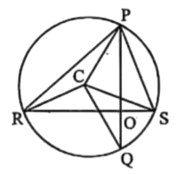এখানে, C কেন্দ্রবিশিষ্ট বৃত্তে PQ এবং RS জ্যা দুইটি বৃত্তের অভ্যন্তরে O বিন্দুতে সমকোণে ছেদ করেছে। C, P ; C, R ; C, Q এবং C, S যোগ করায় কেন্দ্রে ∠PCR ও ∠QCS উৎপন্ন হলো।