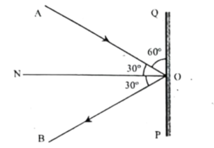 মনে করি, PQ দর্পণের হচ্ছে আপতন বিন্দু।  O বিন্দুতে ON অভিলম্ব AO আপতিত রশ্মি আয়নার সাথে 60° কোণ উৎপন্ন করে। AO রশ্মি প্রতিফলনের পর OB পথে চলে যায়।