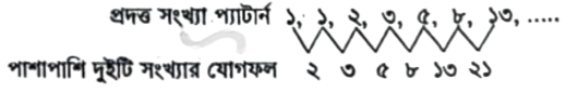 প্রদত্ত সংখ্যা প্যাটার্নটির মধ্যে মিল রয়েছে। সংখ্যা প্যাটার্নটির পরপর দুইটি সংখ্যার যোগফল পরবর্তী সংখ্যার সমান। তালিকার পরবর্তী সংখ্যাটি হবে = ৮ + ১৩ = ২১ তালিকার পরবর্তী সংখ্যা ২১।