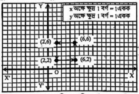 ছক কাগজে উভয় অক্ষ বরাবর ক্ষুদ্রতম। বর্গঘরের বাহুর দৈর্ঘ্যকে 1 একক ধরে (2, 2), (6, 2), (6, 6), (2, 6) বিন্দুগুলো স্থাপন করি। তারপর বিন্দুগুলো তীরচিহ্ন অনুযায়ী যোগ করি।