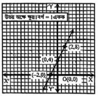 মনে করি, পরস্পর লম্ব XOX'ও YOY' যথাক্রমে x-অক্ষ ও .y-অক্ষ এবং ০ মূলবিন্দু। ছক কাগজে উভয় অক্ষ বরাবর ক্ষুদ্রতম । বর্গঘরের বাহুর দৈর্ঘ্যকে 1 একক ধরে (0, 4), (2, 8), (-2, 0) বিন্দুগুলো স্থাপন করি। তারপর বিন্দুগুলো পরস্পর। সংযোগ করি।
