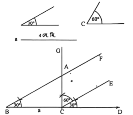 (৩) এখন C বিন্দুতে ∠C এর সমান করে ∠ECG আঁকি। CG রেখা BF-কে A বিন্দুতে ছেদ করে। তাহলে △ ABC-ই নির্ণেয় ত্রিভুজ।