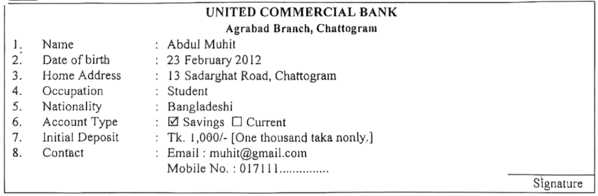 Suppose, Muhit lives at 13 Sadarghat Road, Chattogram. He reads in Agrabad Govt. Primary School. He was born on 23 February 2012. He wants to open an account with a bank.