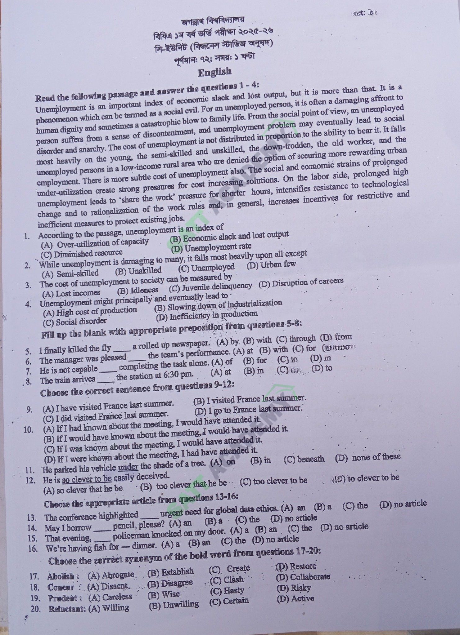জগন্নাথ বিশ্ববিদ্যালয় - সি ইউনিট (নন-কমার্স) (বিজনেস স্টাডিজ অনুষদ) শিক্ষাবর্ষ : ২০২৫-২০২৬ (27-12-2025) এর মূল প্রশ্ন ও সমাধান, Hard Copy প্রশ্ন আপলোড, প্রশ্ন ব্যাংক আপলোড, MCQ