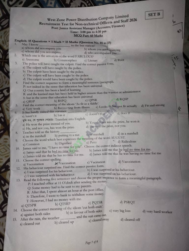 West Zone Power Distribution Company Limited - Junior Assistant Manager (Accounts/Finance) (24-01-2026) এর মূল প্রশ্ন ও সমাধান, Hard Copy প্রশ্ন আপলোড, প্রশ্ন ব্যাংক আপলোড, MCQ