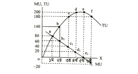 প্রদত্ত তালিকাটি (গ নং-এ) সম্পূর্ণ করে লক্ষ করা যায়, ১ম একক হতে মোট উপযোগ ৪০ একক, যা পাশের চিত্রে এ বিন্দু দ্বারা নির্দেশিত হয়েছে। একইভাবে ২য়, ৩য়, ৪র্থ, ৫ম ও ৬ষ্ঠ একক হতে মোট উপযোগ যথাক্রমে 140, 180, 200, 200 ও 180 একক। যা চিত্রে যথাক্রমে b, c, d, e ও। বিন্দু দ্বারা নির্দেশিত। এখন এই বিন্দুগুলো যোগ করে TU রেখা পাওয়া যায়। অনুরূপভাবে a,b1 c1 d1 ও e1 f1 বিন্দুগুলো যোগ করে MU রেখা পাওয়া যায়। উপরের চিত্রে লক্ষ করা যায়, ৪র্থ এককের পূর্ব পর্যন্ত TU ক্রমহ্রাসমান হারে বাড়তে থাকে এবং MU কমতে থাকে। ৫ম এককে যখন MU শূন্য হয় তখন TU সর্বোচ্চ হয়। আবার, ৫ম এককের পরে যখন MU ঋণাত্মক হয়, তখন TU কমতে থাকে।