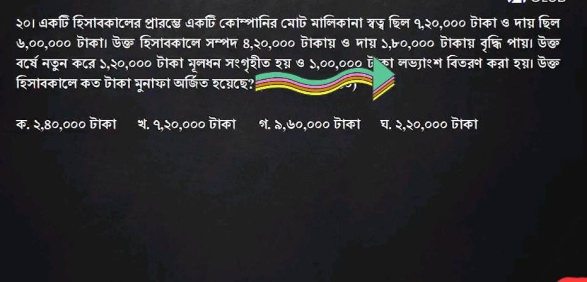 একটি হিসাববালের প্রারম্ভ একটি কোম্পানির মোট মালিকানাস্বত্ত ছিল ৭,২০,০০০ টাকা ও দায় ছিল ৬,০০,০০০ টাকা। উক্ত হিসাবকালে সম্পদ ৪,২০,০০০ টাকা ও দায় ১,৮০,০০০ টাকায় বৃদ্ধি পায়।উক্ত বর্ষে নতুন করে ১,২০,০০০ টাকা মূলধন সংগৃহীত করা হয় ও ১,০০,০০ টাকা লভ্যাংশ বিতরণ করা হয় । উক্ত হিসাবকালে কত টাকা মুনাফা অর্জিত হয়েছে?